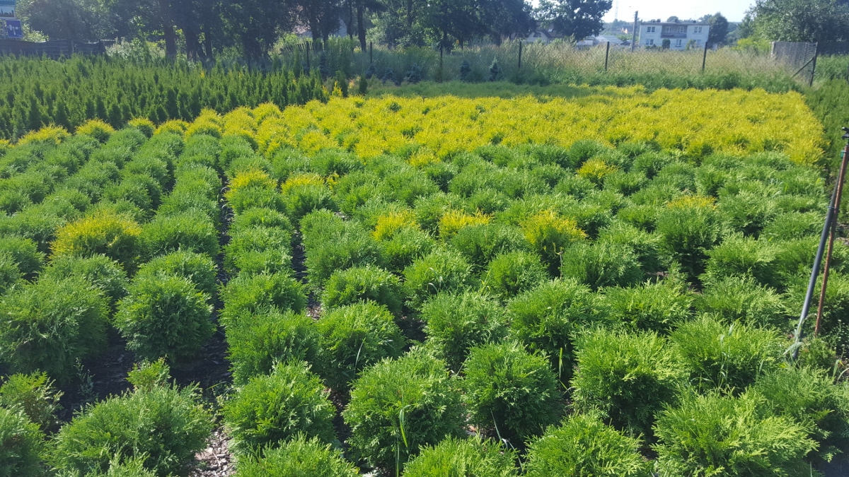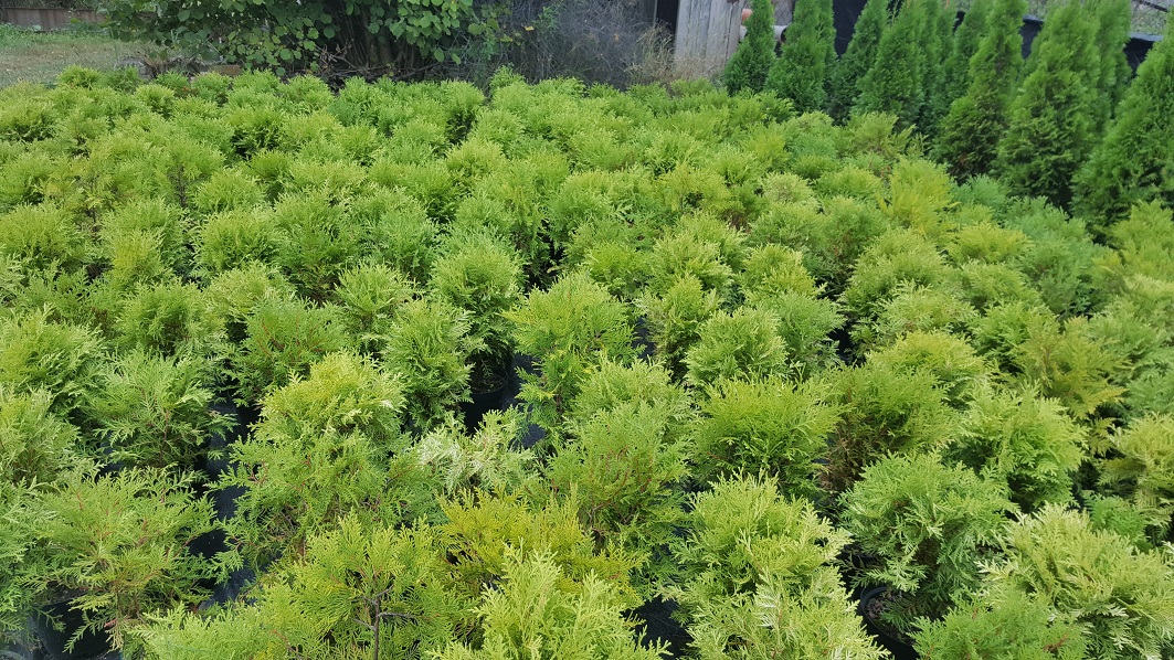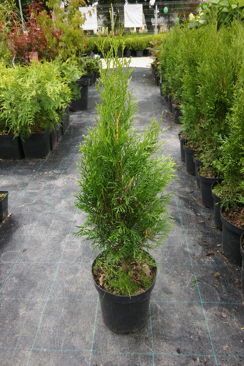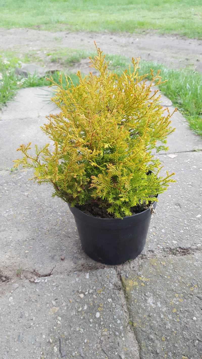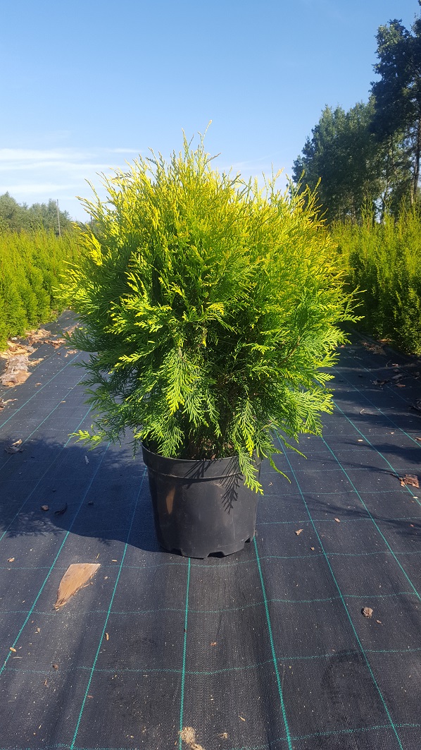 Tuja zółta. W doniczkach lub kopana.